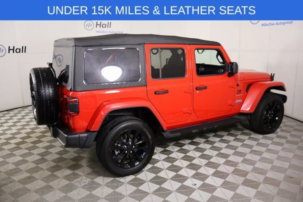 CARFAX One-Owner. Firecracker Red Clearcoat 2023 Jeep Wrangler Sahara 4xe 4WD 8-Speed Automatic 2.0L I4 DOHC Wrangler Sahara 4xe, 4D Sport Utility, 2.0L I4 DOHC, 8-Speed Automatic, 4WD, Firecracker Red Clearcoat, Black Leather, We are currently offering Vehicle Purchase Home Delivery by appointment. Please contact for details., Navigation System, Quick Order Package 29P Sahara.